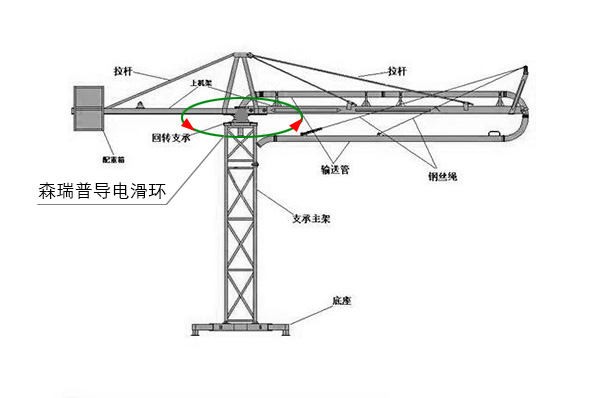 下图是布料机的原理结构图,布料机的支撑主架是固定不动的,回转支承和以上部位是需要360度旋转的,滑环的工作原理就是通过电刷接触的方式实现360度旋转,因此通过安装滑环就可以防止电机的电缆绕线。