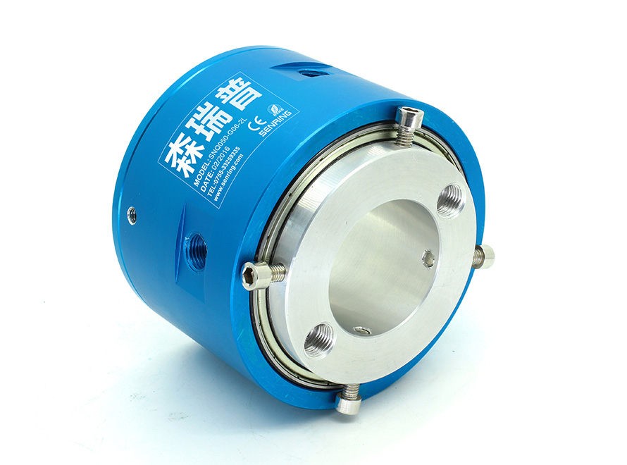 厦门某创新机器是一家专业从事全自动塑料包装设备(包括多种生产线设备)的研发、生产的企业,他们有个设备中需要传输1路气。旋转部位的旋转轴的直径是35mm,需要的滑环要求中心孔径35mm,管子6mm、8mm、10mm均可,压力不大,0.4MPa。由于这个35mm的旋转轴必须要穿过去,所以米兰app体育官方入口下载手机版小孔径的气滑环就没法安装了,只能采用这种较大孔径的中空气滑环了,如下图所示,滑环的转子上有4颗固定螺丝,可以固定在旋转轴上。定子部分,也就是蓝色外壳了,上面有几个固定孔,可以通过螺丝来固定。
